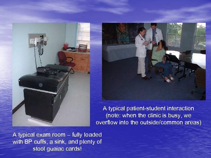 A typical patient-student interaction (note: when the clinic is busy, we overflow into the outside/common areas) A typical exam room – fully loaded with BP cuffs, a sink, and plenty of stool guaiac cards!