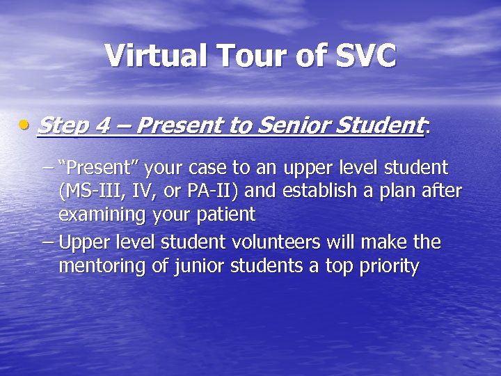 Virtual Tour of SVC • Step 4 – Present to Senior Student: – “Present” your case to an upper level student (MS-III, IV, or PA-II) and establish a plan after examining your patient – Upper level student volunteers will make the mentoring of junior students a top priority