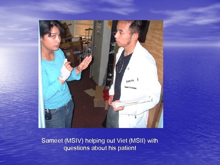 Sameet (MSIV) helping out Viet (MSII) with questions about his patient