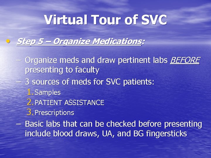 Virtual Tour of SVC • Step 5 – Organize Medications: – Organize meds and draw pertinent labs BEFORE presenting to faculty – 3 sources of meds for SVC patients: 1. Samples 2. PATIENT ASSISTANCE 3. Prescriptions – Basic labs that can be checked before presenting include blood draws, UA, and BG fingersticks