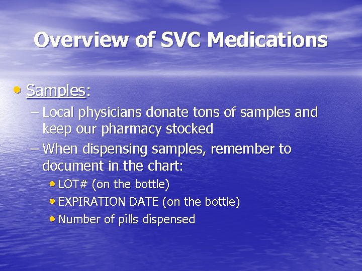 Overview of SVC Medications • Samples: – Local physicians donate tons of samples and keep our pharmacy stocked – When dispensing samples, remember to document in the chart: • LOT# (on the bottle) • EXPIRATION DATE (on the bottle) • Number of pills dispensed