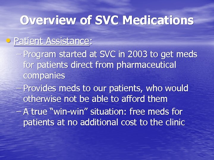 Overview of SVC Medications • Patient Assistance: – Program started at SVC in 2003 to get meds for patients direct from pharmaceutical companies – Provides meds to our patients, who would otherwise not be able to afford them – A true “win-win” situation: free meds for patients at no additional cost to the clinic