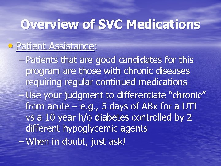 Overview of SVC Medications • Patient Assistance: – Patients that are good candidates for this program are those with chronic diseases requiring regular continued medications – Use your judgment to differentiate “chronic” from acute – e. g. , 5 days of ABx for a UTI vs a 10 year h/o diabetes controlled by 2 different hypoglycemic agents – When in doubt, just ask!