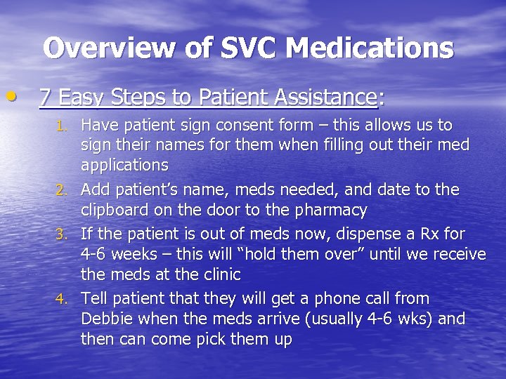 Overview of SVC Medications • 7 Easy Steps to Patient Assistance: 1. Have patient sign consent form – this allows us to sign their names for them when filling out their med applications 2. Add patient’s name, meds needed, and date to the clipboard on the door to the pharmacy 3. If the patient is out of meds now, dispense a Rx for 4 -6 weeks – this will “hold them over” until we receive the meds at the clinic 4. Tell patient that they will get a phone call from Debbie when the meds arrive (usually 4 -6 wks) and then can come pick them up