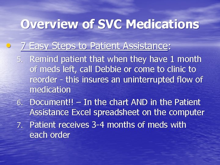Overview of SVC Medications • 7 Easy Steps to Patient Assistance: 5. Remind patient that when they have 1 month of meds left, call Debbie or come to clinic to reorder - this insures an uninterrupted flow of medication 6. Document!! – In the chart AND in the Patient Assistance Excel spreadsheet on the computer 7. Patient receives 3 -4 months of meds with each order