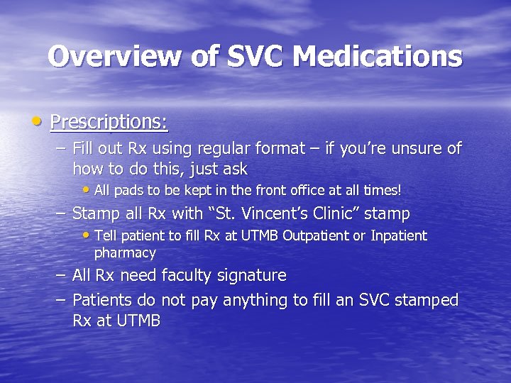 Overview of SVC Medications • Prescriptions: – Fill out Rx using regular format – if you’re unsure of how to do this, just ask • All pads to be kept in the front office at all times! – Stamp all Rx with “St. Vincent’s Clinic” stamp • Tell patient to fill Rx at UTMB Outpatient or Inpatient pharmacy – All Rx need faculty signature – Patients do not pay anything to fill an SVC stamped Rx at UTMB
