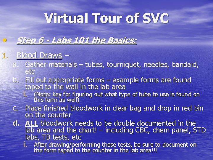 Virtual Tour of SVC • Step 6 - Labs 101 the Basics: 1. Blood Draws – a. Gather materials – tubes, tourniquet, needles, bandaid, etc b. Fill out appropriate forms – example forms are found taped to the wall in the lab area i. (Note: key for figuring out what type of tube to use is found on this form as well) c. Place finished bloodwork in clear bag and drop in red bin on the counter d. ALL bloodwork needs to be double documented in the lab area and the chart! – including CBC, chem panel, STD labs, TB tests, etc i. After drawing/performing these tests, be sure to document on the form taped to the counter in the lab area!!!
