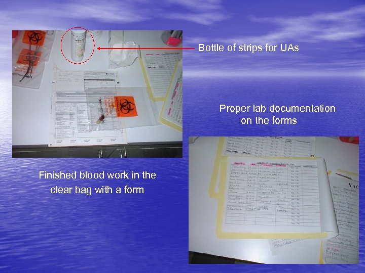 Bottle of strips for UAs Proper lab documentation on the forms Finished blood work in the clear bag with a form
