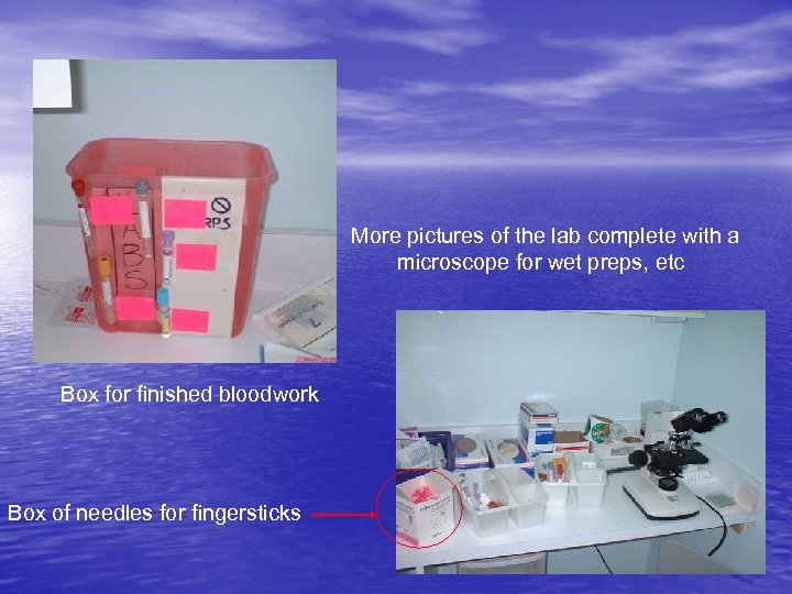 More pictures of the lab complete with a microscope for wet preps, etc Box for finished bloodwork Box of needles for fingersticks