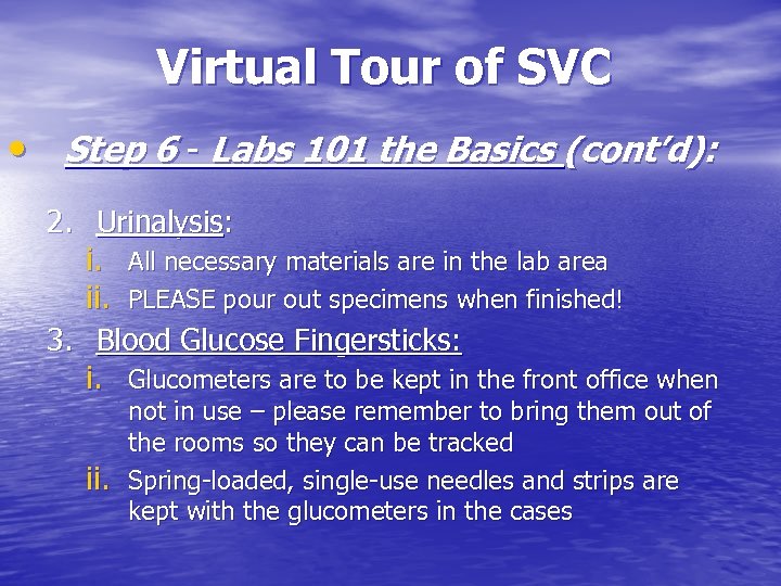Virtual Tour of SVC • Step 6 - Labs 101 the Basics (cont’d): 2. Urinalysis: i. All necessary materials are in the lab area ii. PLEASE pour out specimens when finished! 3. Blood Glucose Fingersticks: i. Glucometers are to be kept in the front office when ii. not in use – please remember to bring them out of the rooms so they can be tracked Spring-loaded, single-use needles and strips are kept with the glucometers in the cases