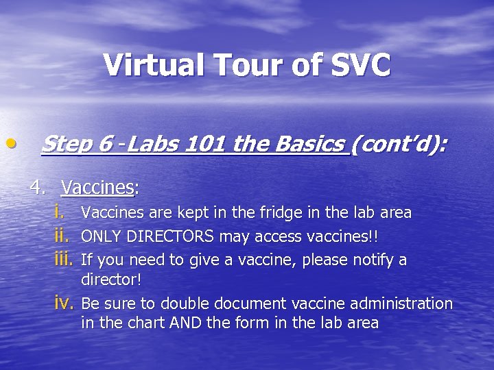 Virtual Tour of SVC • Step 6 -Labs 101 the Basics (cont’d): 4. Vaccines: i. Vaccines are kept in the fridge in the lab area ii. ONLY DIRECTORS may access vaccines!! iii. If you need to give a vaccine, please notify a iv. director! Be sure to double document vaccine administration in the chart AND the form in the lab area