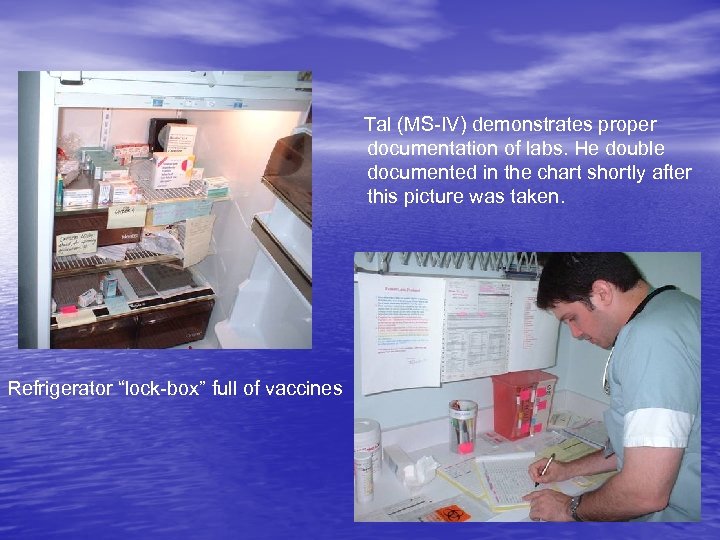 Tal (MS-IV) demonstrates proper documentation of labs. He double documented in the chart shortly after this picture was taken. Refrigerator “lock-box” full of vaccines