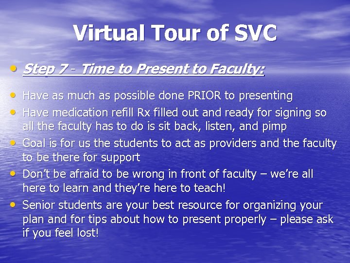 Virtual Tour of SVC • Step 7 - Time to Present to Faculty: • Have as much as possible done PRIOR to presenting • Have medication refill Rx filled out and ready for signing so • • • all the faculty has to do is sit back, listen, and pimp Goal is for us the students to act as providers and the faculty to be there for support Don’t be afraid to be wrong in front of faculty – we’re all here to learn and they’re here to teach! Senior students are your best resource for organizing your plan and for tips about how to present properly – please ask if you feel lost!