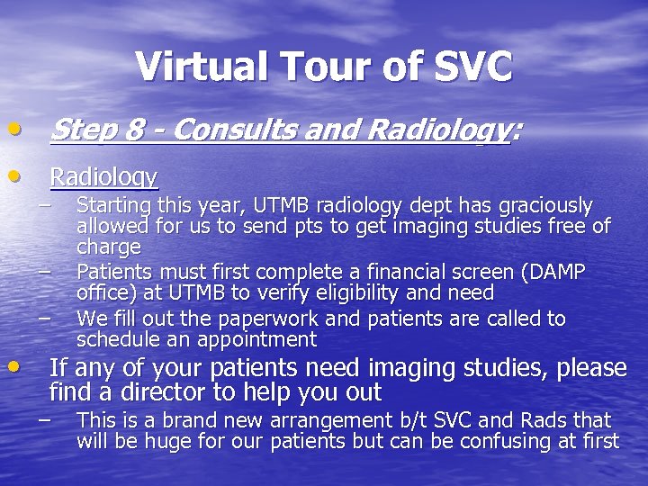 Virtual Tour of SVC • Step 8 - Consults and Radiology: • Radiology – – – Starting this year, UTMB radiology dept has graciously allowed for us to send pts to get imaging studies free of charge Patients must first complete a financial screen (DAMP office) at UTMB to verify eligibility and need We fill out the paperwork and patients are called to schedule an appointment • If any of your patients need imaging studies, please find a director to help you out – This is a brand new arrangement b/t SVC and Rads that will be huge for our patients but can be confusing at first