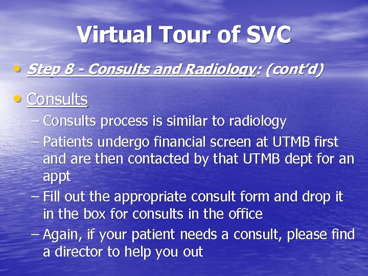 Virtual Tour of SVC • Step 8 - Consults and Radiology: (cont’d) • Consults – Consults process is similar to radiology – Patients undergo financial screen at UTMB first and are then contacted by that UTMB dept for an appt – Fill out the appropriate consult form and drop it in the box for consults in the office – Again, if your patient needs a consult, please find a director to help you out