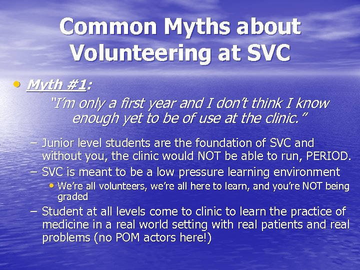 Common Myths about Volunteering at SVC • Myth #1: “I’m only a first year and I don’t think I know enough yet to be of use at the clinic. ” – Junior level students are the foundation of SVC and without you, the clinic would NOT be able to run, PERIOD. – SVC is meant to be a low pressure learning environment • We’re all volunteers, we’re all here to learn, and you’re NOT being graded – Student at all levels come to clinic to learn the practice of medicine in a real world setting with real patients and real problems (no POM actors here!)