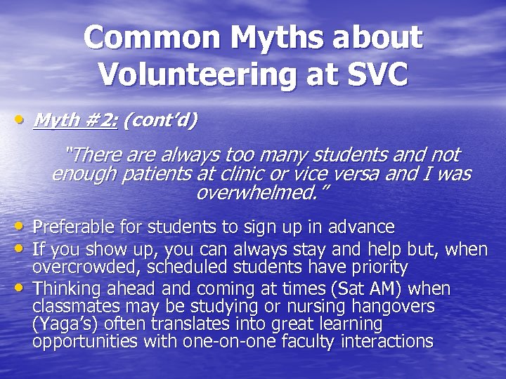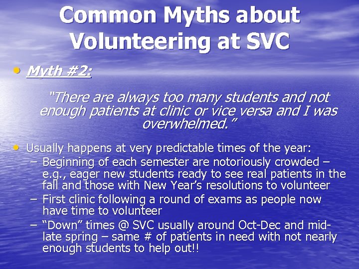 Common Myths about Volunteering at SVC • Myth #2: “There always too many students and not enough patients at clinic or vice versa and I was overwhelmed. ” • Usually happens at very predictable times of the year: – Beginning of each semester are notoriously crowded – e. g. , eager new students ready to see real patients in the fall and those with New Year’s resolutions to volunteer – First clinic following a round of exams as people now have time to volunteer – “Down” times @ SVC usually around Oct-Dec and midlate spring – same # of patients in need with not nearly enough students to help out!!