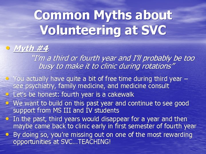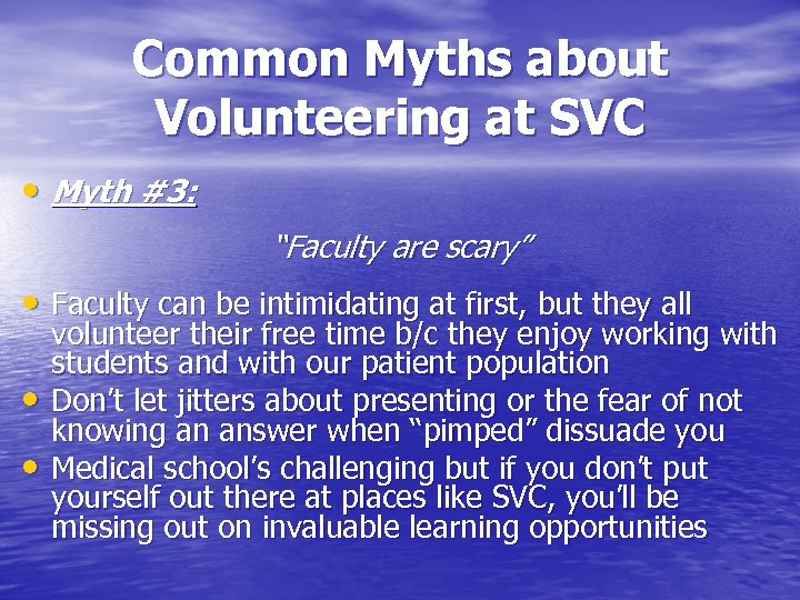 Common Myths about Volunteering at SVC • Myth #3: “Faculty are scary” • Faculty can be intimidating at first, but they all • • volunteer their free time b/c they enjoy working with students and with our patient population Don’t let jitters about presenting or the fear of not knowing an answer when “pimped” dissuade you Medical school’s challenging but if you don’t put yourself out there at places like SVC, you’ll be missing out on invaluable learning opportunities