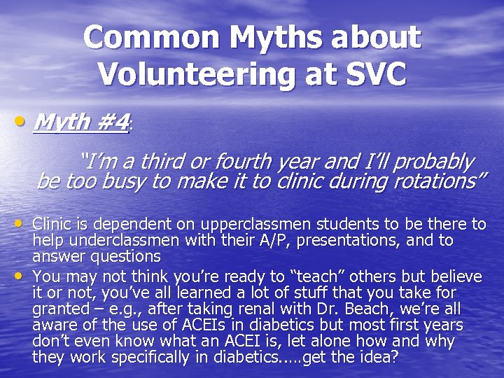 Common Myths about Volunteering at SVC • Myth #4: “I’m a third or fourth year and I’ll probably be too busy to make it to clinic during rotations” • Clinic is dependent on upperclassmen students to be there to • help underclassmen with their A/P, presentations, and to answer questions You may not think you’re ready to “teach” others but believe it or not, you’ve all learned a lot of stuff that you take for granted – e. g. , after taking renal with Dr. Beach, we’re all aware of the use of ACEIs in diabetics but most first years don’t even know what an ACEI is, let alone how and why they work specifically in diabetics. . …get the idea?