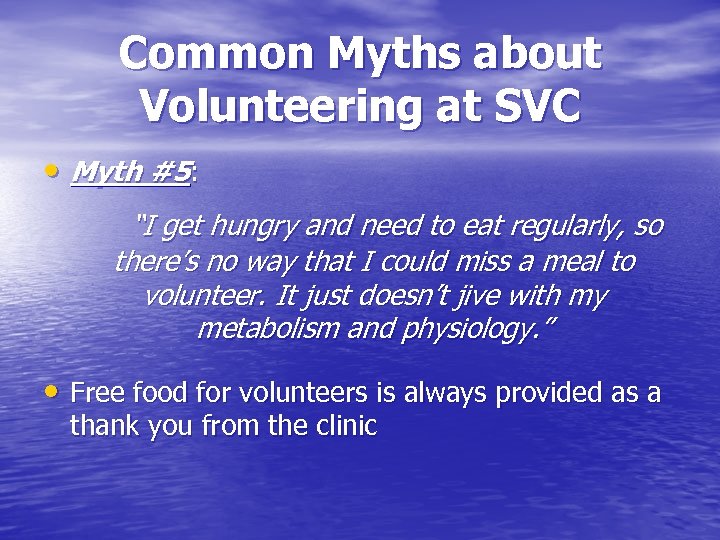 Common Myths about Volunteering at SVC • Myth #5: “I get hungry and need to eat regularly, so there’s no way that I could miss a meal to volunteer. It just doesn’t jive with my metabolism and physiology. ” • Free food for volunteers is always provided as a thank you from the clinic