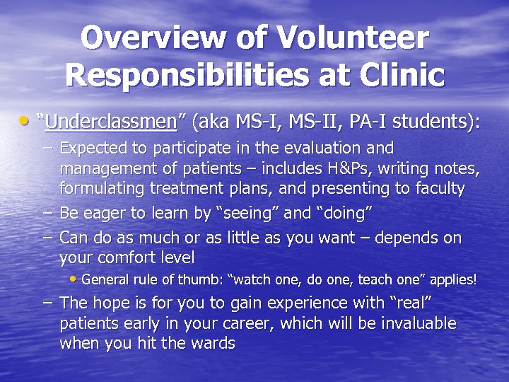 Overview of Volunteer Responsibilities at Clinic • “Underclassmen” (aka MS-I, MS-II, PA-I students): – Expected to participate in the evaluation and management of patients – includes H&Ps, writing notes, formulating treatment plans, and presenting to faculty – Be eager to learn by “seeing” and “doing” – Can do as much or as little as you want – depends on your comfort level • General rule of thumb: “watch one, do one, teach one” applies! – The hope is for you to gain experience with “real” patients early in your career, which will be invaluable when you hit the wards