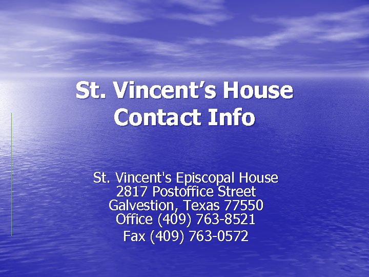 St. Vincent’s House Contact Info St. Vincent's Episcopal House 2817 Postoffice Street Galvestion, Texas 77550 Office (409) 763 -8521 Fax (409) 763 -0572