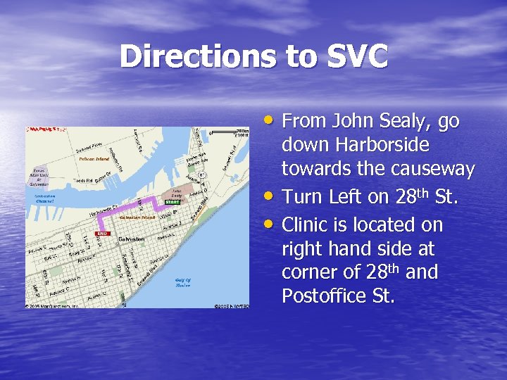 Directions to SVC • From John Sealy, go • • down Harborside towards the causeway Turn Left on 28 th St. Clinic is located on right hand side at corner of 28 th and Postoffice St.