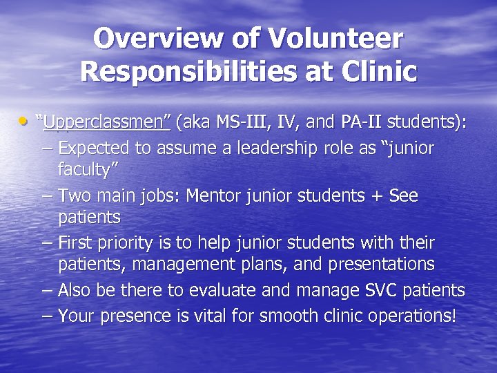 Overview of Volunteer Responsibilities at Clinic • “Upperclassmen” (aka MS-III, IV, and PA-II students): – Expected to assume a leadership role as “junior faculty” – Two main jobs: Mentor junior students + See patients – First priority is to help junior students with their patients, management plans, and presentations – Also be there to evaluate and manage SVC patients – Your presence is vital for smooth clinic operations!
