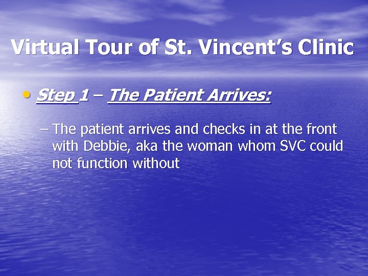 Virtual Tour of St. Vincent’s Clinic • Step 1 – The Patient Arrives: – The patient arrives and checks in at the front with Debbie, aka the woman whom SVC could not function without