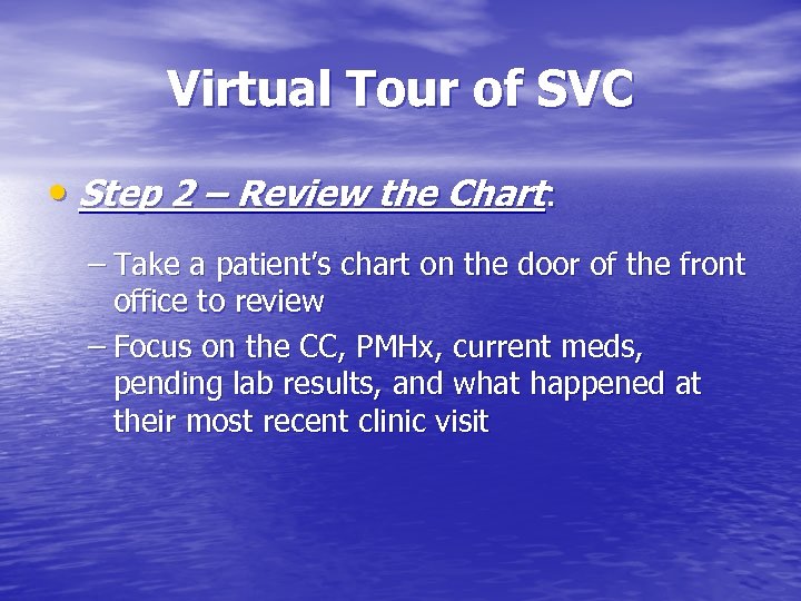 Virtual Tour of SVC • Step 2 – Review the Chart: – Take a patient’s chart on the door of the front office to review – Focus on the CC, PMHx, current meds, pending lab results, and what happened at their most recent clinic visit