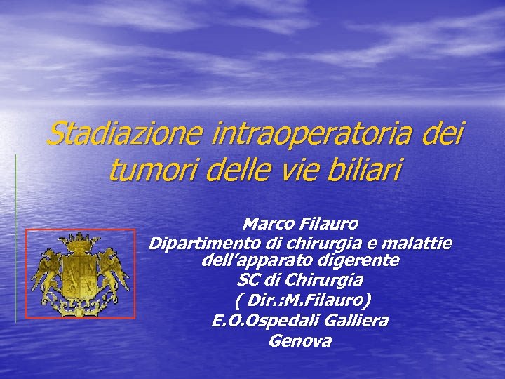 Stadiazione intraoperatoria dei tumori delle vie biliari Marco Filauro Dipartimento di chirurgia e malattie dell’apparato digerente SC di Chirurgia ( Dir. : M. Filauro) E. O. Ospedali Galliera Genova