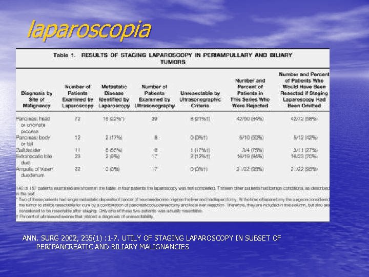 laparoscopia ANN. SURG 2002, 235(1) : 1 -7. UTILY OF STAGING LAPAROSCOPY IN SUBSET OF PERIPANCREATIC AND BILIARY MALIGNANCIES