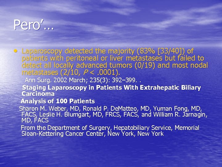 Pero’… • Laparoscopy detected the majority (83% [33/40]) of patients with peritoneal or liver metastases but failed to detect all locally advanced tumors (0/19) and most nodal metastases (2/10, P <. 0001). Ann Surg. 2002 March; 235(3): 392– 399. . Staging Laparoscopy in Patients With Extrahepatic Biliary Carcinoma Analysis of 100 Patients Sharon M. Weber, MD, Ronald P. De. Matteo, MD, Yuman Fong, MD, FACS, Leslie H. Blumgart, MD, FRCS, FACS, and William R. Jarnagin, MD, FACS From the Department of Surgery, Hepatobiliary Service, Memorial Sloan-Kettering Cancer Center, New York