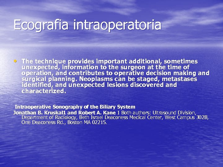 Ecografia intraoperatoria • The technique provides important additional, sometimes unexpected, information to the surgeon at the time of operation, and contributes to operative decision making and surgical planning. Neoplasms can be staged, metastases identified, and unexpected lesions discovered and characterized. Intraoperative Sonography of the Biliary System Jonathan B. Kruskal 1 and Robert A. Kane 1 Both authors: Ultrasound Division, Department of Radiology, Beth Israel Deaconess Medical Center, West Campus 302 B, One Deaconess Rd. , Boston MA 02215.