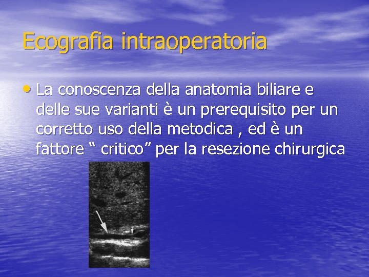 Ecografia intraoperatoria • La conoscenza della anatomia biliare e delle sue varianti è un prerequisito per un corretto uso della metodica , ed è un fattore “ critico” per la resezione chirurgica