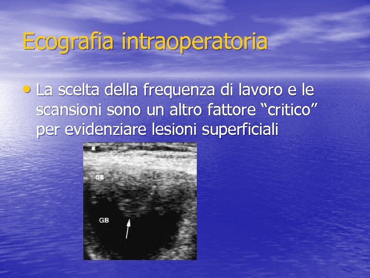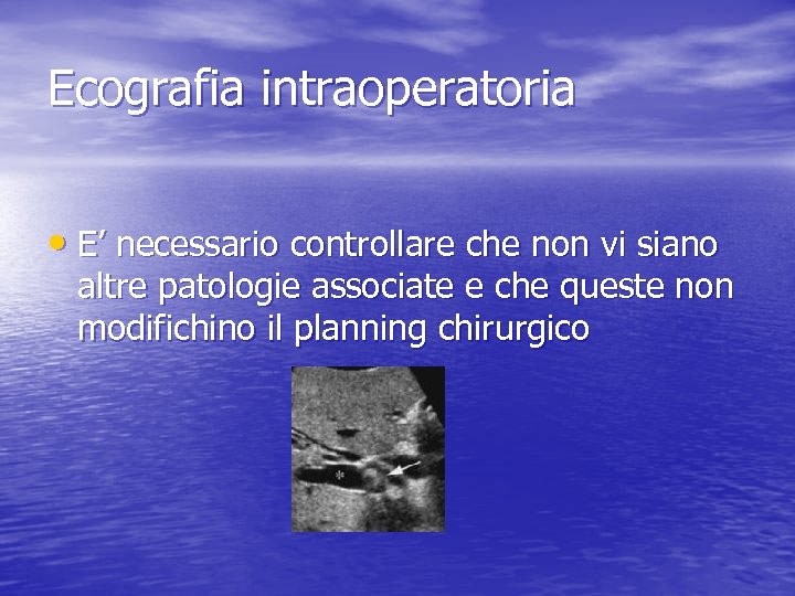 Ecografia intraoperatoria • E’ necessario controllare che non vi siano altre patologie associate e che queste non modifichino il planning chirurgico