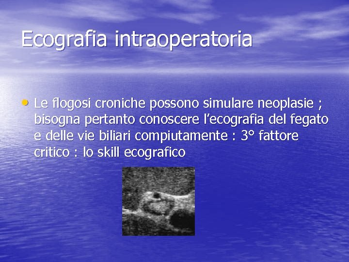 Ecografia intraoperatoria • Le flogosi croniche possono simulare neoplasie ; bisogna pertanto conoscere l’ecografia del fegato e delle vie biliari compiutamente : 3° fattore critico : lo skill ecografico