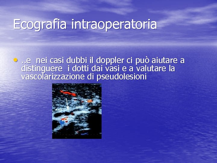 Ecografia intraoperatoria • . . e nei casi dubbi il doppler ci può aiutare a distinguere i dotti dai vasi e a valutare la vascolarizzazione di pseudolesioni