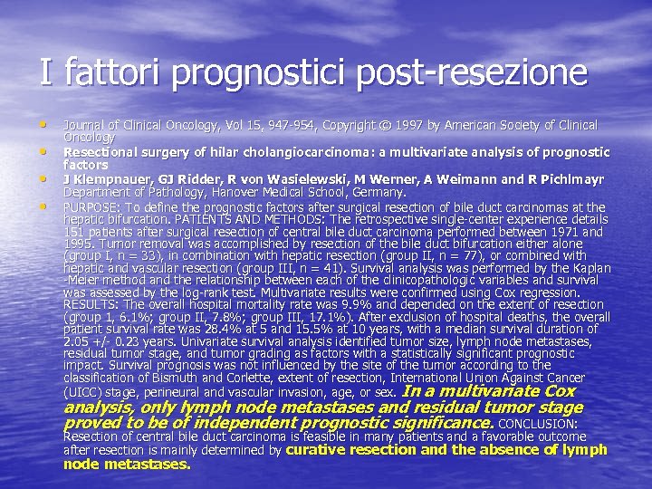I fattori prognostici post-resezione • • Journal of Clinical Oncology, Vol 15, 947 -954, Copyright © 1997 by American Society of Clinical Oncology Resectional surgery of hilar cholangiocarcinoma: a multivariate analysis of prognostic factors J Klempnauer, GJ Ridder, R von Wasielewski, M Werner, A Weimann and R Pichlmayr Department of Pathology, Hanover Medical School, Germany. PURPOSE: To define the prognostic factors after surgical resection of bile duct carcinomas at the hepatic bifurcation. PATIENTS AND METHODS: The retrospective single-center experience details 151 patients after surgical resection of central bile duct carcinoma performed between 1971 and 1995. Tumor removal was accomplished by resection of the bile duct bifurcation either alone (group I, n = 33), in combination with hepatic resection (group II, n = 77), or combined with hepatic and vascular resection (group III, n = 41). Survival analysis was performed by the Kaplan -Meier method and the relationship between each of the clinicopathologic variables and survival was assessed by the log-rank test. Multivariate results were confirmed using Cox regression. RESULTS: The overall hospital mortality rate was 9. 9% and depended on the extent of resection (group 1, 6. 1%; group II, 7. 8%; group III, 17. 1%). After exclusion of hospital deaths, the overall patient survival rate was 28. 4% at 5 and 15. 5% at 10 years, with a median survival duration of 2. 05 +/- 0. 23 years. Univariate survival analysis identified tumor size, lymph node metastases, residual tumor stage, and tumor grading as factors with a statistically significant prognostic impact. Survival prognosis was not influenced by the site of the tumor according to the classification of Bismuth and Corlette, extent of resection, International Union Against Cancer (UICC) stage, perineural and vascular invasion, age, or sex. In a multivariate Cox analysis, only lymph node metastases and residual tumor stage proved to be of independent prognostic significance. CONCLUSION: Resection of central bile duct carcinoma is feasible in many patients and a favorable outcome after resection is mainly determined by curative resection and the absence of lymph node metastases.