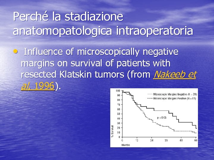 Perché la stadiazione anatomopatologica intraoperatoria • Influence of microscopically negative margins on survival of patients with resected Klatskin tumors (from Nakeeb et al, 1996).