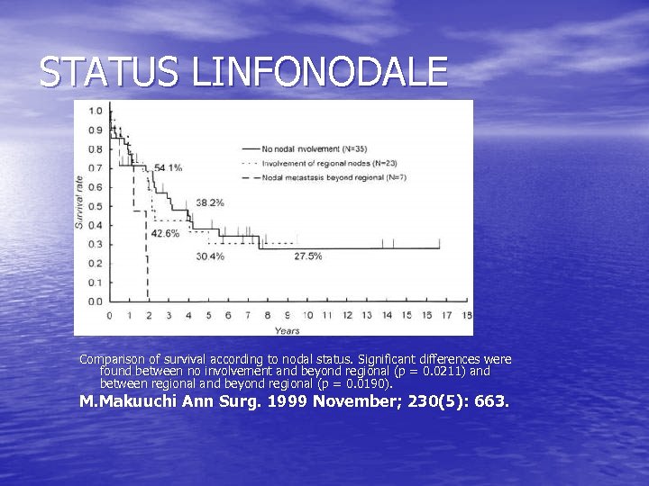 STATUS LINFONODALE Comparison of survival according to nodal status. Significant differences were found between no involvement and beyond regional (p = 0. 0211) and between regional and beyond regional (p = 0. 0190). M. Makuuchi Ann Surg. 1999 November; 230(5): 663.