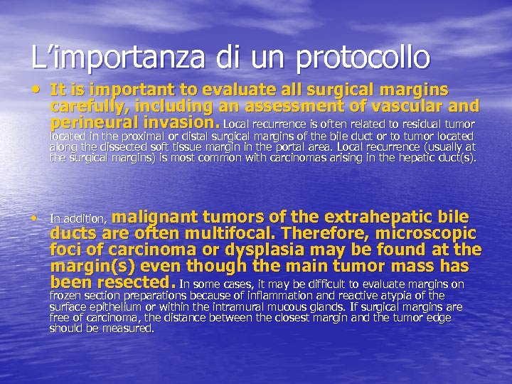 L’importanza di un protocollo • It is important to evaluate all surgical margins carefully, including an assessment of vascular and perineural invasion. Local recurrence is often related to residual tumor located in the proximal or distal surgical margins of the bile duct or to tumor located along the dissected soft tissue margin in the portal area. Local recurrence (usually at the surgical margins) is most common with carcinomas arising in the hepatic duct(s). • In addition, malignant tumors of the extrahepatic bile ducts are often multifocal. Therefore, microscopic foci of carcinoma or dysplasia may be found at the margin(s) even though the main tumor mass has been resected. In some cases, it may be difficult to evaluate margins on frozen section preparations because of inflammation and reactive atypia of the surface epithelium or within the intramural mucous glands. If surgical margins are free of carcinoma, the distance between the closest margin and the tumor edge should be measured.