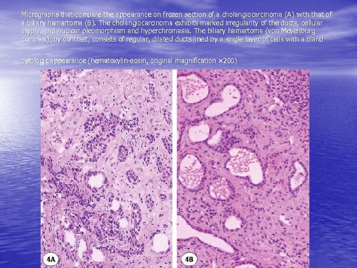 Micrographs that compare the appearance on frozen section of a cholangiocarcinoma (A) with that of a biliary hamartoma (B). The cholangiocarcinoma exhibits marked irregularity of the ducts, cellular atypia, and nuclear pleomorphism and hyperchromasia. The biliary hamartoma (von Meyenburg complex), by contrast, consists of regular, dilated ducts lined by a single layer of cells with a bland cytologic appearance (hematoxylin-eosin, original magnification × 200)