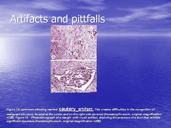 Artifacts and pittfalls cautery Figure 13: specimen showing marked artifact. This creates difficulties in the recognition of malignant structure, located at the center and on the right side (arrows) (hematoxylin-eosin, original magnification × 120). Figure 14. Photomicrograph of a margin with crush artifact, depicting the presence of a duct that exhibits significant dysplasia (hematoxylin-eosin, original magnification × 200)