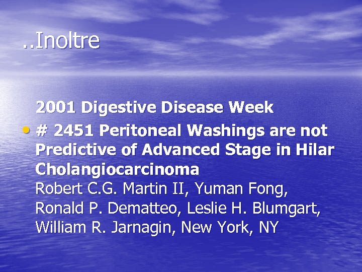 . . Inoltre 2001 Digestive Disease Week • # 2451 Peritoneal Washings are not Predictive of Advanced Stage in Hilar Cholangiocarcinoma Robert C. G. Martin II, Yuman Fong, Ronald P. Dematteo, Leslie H. Blumgart, William R. Jarnagin, New York, NY