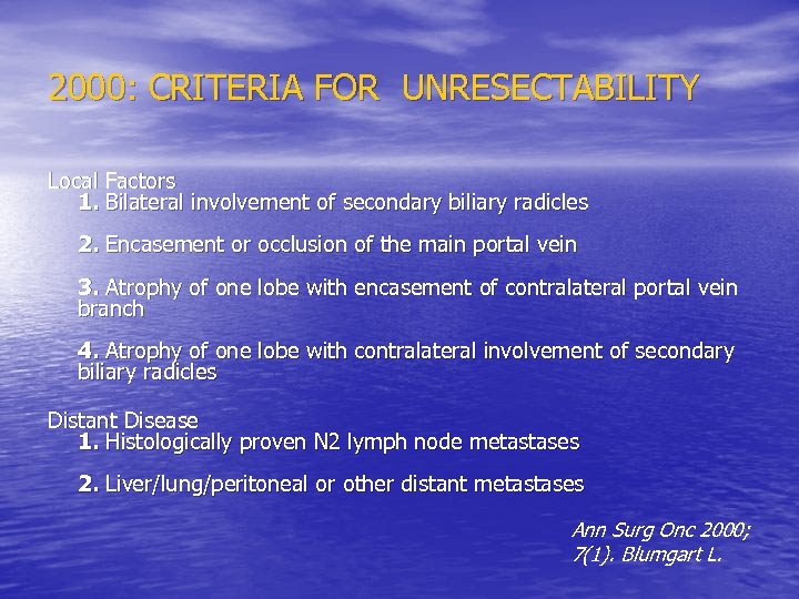 2000: CRITERIA FOR UNRESECTABILITY Local Factors 1. Bilateral involvement of secondary biliary radicles 2. Encasement or occlusion of the main portal vein 3. Atrophy of one lobe with encasement of contralateral portal vein branch 4. Atrophy of one lobe with contralateral involvement of secondary biliary radicles Distant Disease 1. Histologically proven N 2 lymph node metastases 2. Liver/lung/peritoneal or other distant metastases Ann Surg Onc 2000; 7(1). Blumgart L.