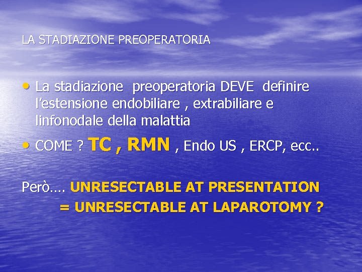 LA STADIAZIONE PREOPERATORIA • La stadiazione preoperatoria DEVE definire l’estensione endobiliare , extrabiliare e linfonodale della malattia • COME ? TC , RMN , Endo US , ERCP, ecc. . Però…. UNRESECTABLE AT PRESENTATION = UNRESECTABLE AT LAPAROTOMY ?