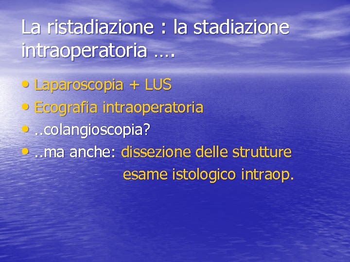 La ristadiazione : la stadiazione intraoperatoria …. • Laparoscopia + LUS • Ecografia intraoperatoria • . . colangioscopia? • . . ma anche: dissezione delle strutture esame istologico intraop.