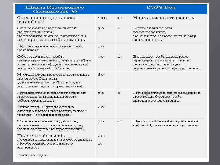 Для дальнейшего планирования лечения обязательным является оценка общего состояния пациента (Performance status) по шкале Карновского и ECOG-B 03