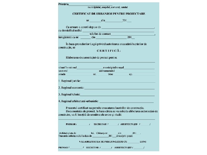 URBANISM CERTIFICATE Informative Urbanism Certificate – an optional act, issued by the issuer, within which the applicant (recipient) is informed on elements that characterize the legal, technical and architectural-urban of a building/land, established through the urbanism and spatial planning documentation, necessary for sale and purchase, renting, dissolution, consolidation, sharing, inheritance of the land for the building construction or planning reconstruction, and in case of property disputes. 12